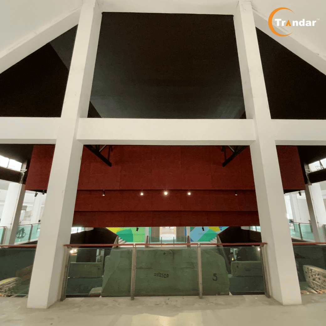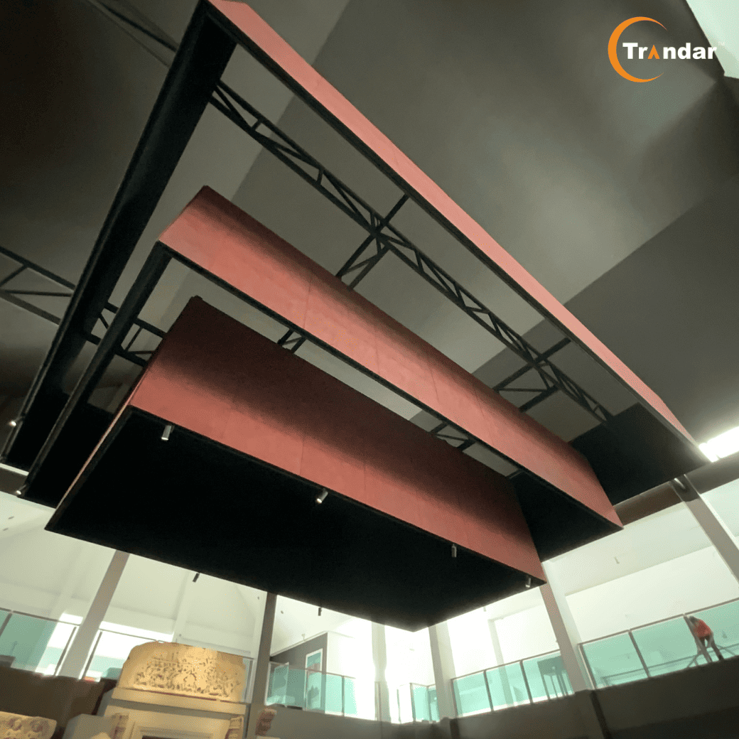 해답은 Trandar Zivana입니다. 이는 감성적 및 기능적 요구를 동시에 충족시키는 흡음 패널입니다. 전시 구역의 주요 부분, 수직 및 수평 천장에 390제곱미터 이상을 덮도록 사용되었으며, 능숙하게 착색된 흡음 패널을 통해 깊이와 아름다움을 더하고 전체적인 디자인과 조화를 이루었습니다. 그 결과, 더욱 조용한 공간일 뿐만 아니라 방문객이 역사의 이야기에 완전히 집중할 수 있는 공간이 되었습니다. 울림은 점차 사라지고,