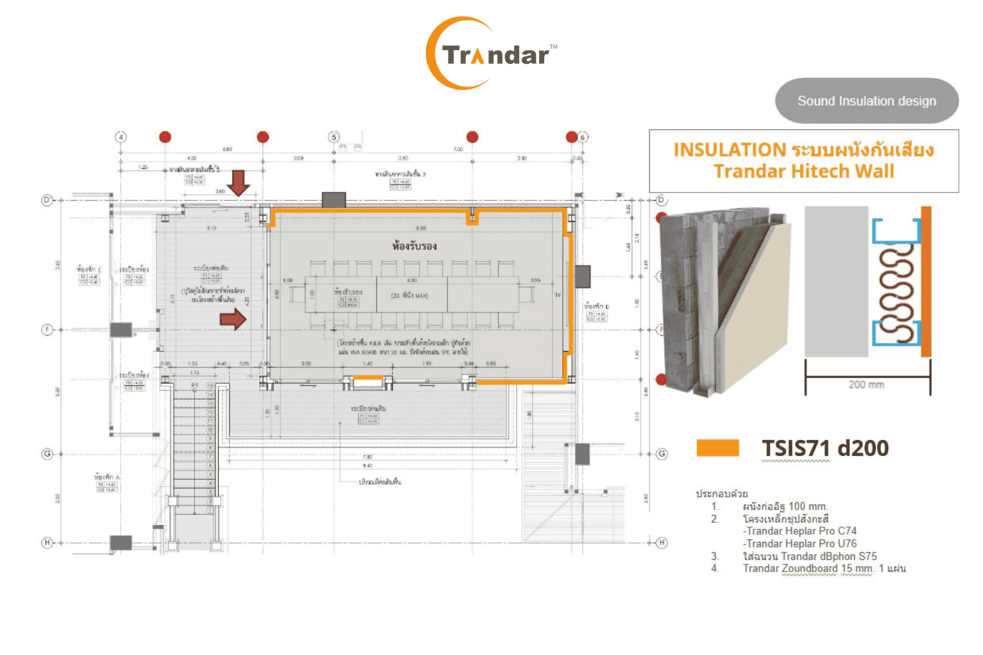 ทีมออกแบบจึงเลือกใช้ ผนังกันเสียง Trandar HiTech Wall รุ่น TSIS71d200
